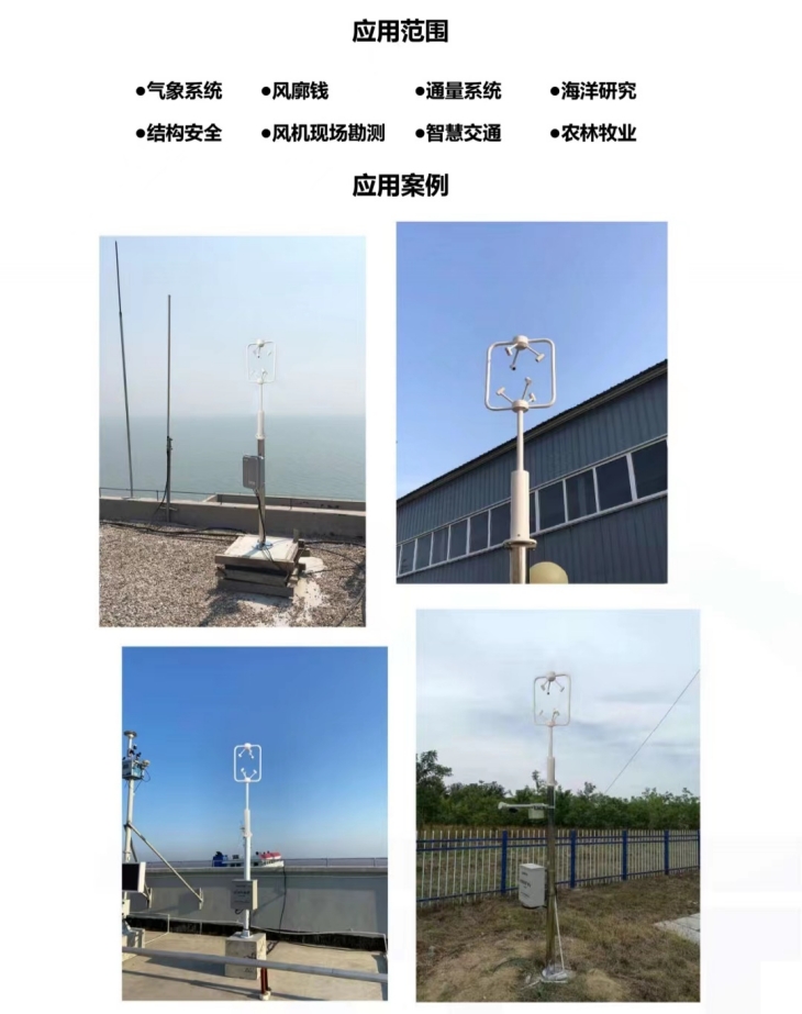 三維超聲波風(fēng)速風(fēng)向傳感器具有結(jié)構(gòu)緊湊,沒有任何移動部件,堅(jiān)固 耐用的特點(diǎn)。能夠測量水平和垂直方向的風(fēng)向, X/Y/Z軸風(fēng)速(即U、V、 W矢量輸出)??梢赃m應(yīng)在各種環(huán)境下,全天候、長久的正常工作,為各 領(lǐng)域的氣象監(jiān)測提供可靠數(shù)據(jù)。三維超聲波風(fēng)向風(fēng)速傳感器用來測量近 地風(fēng)向、風(fēng)速。廣泛應(yīng)用于城市環(huán)境監(jiān)測、風(fēng)力發(fā)電、氣象監(jiān)測、橋梁 隧道、航海船舶、航空機(jī)場等領(lǐng)域。