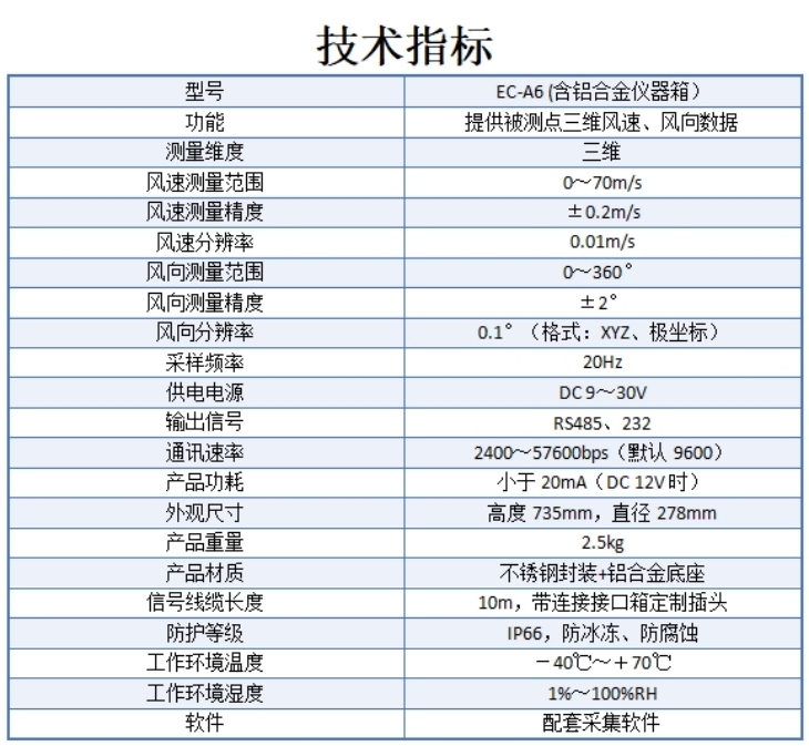 EC-A6型三維超聲波風(fēng)速風(fēng)向傳感器采用先進(jìn)的超聲波測量技術(shù),獨(dú)特的兩根支撐桿結(jié)構(gòu)設(shè)計(jì),大大減小了風(fēng)阻的影響,提升了測量的精度。它具有全金屬材質(zhì),沒有任何移動部件,堅(jiān)固耐用的特點(diǎn),可以同時(shí)測量水平和垂直方向的風(fēng)向, X/Y/Z軸風(fēng)速(即U、V、W矢量輸出),聲溫、聲速等參數(shù)。適應(yīng)在各種環(huán)境下,全天候、長久的正常工作,為各領(lǐng)域的氣象監(jiān)測提供可靠數(shù)據(jù)。三維超聲波風(fēng)向風(fēng)速傳感器用來測量近地風(fēng)向、風(fēng)速。廣泛應(yīng)用于城市環(huán)境監(jiān)測、風(fēng)力發(fā)電、氣象監(jiān)測、橋梁隧道、航海船舶、航空機(jī)場等領(lǐng)域。