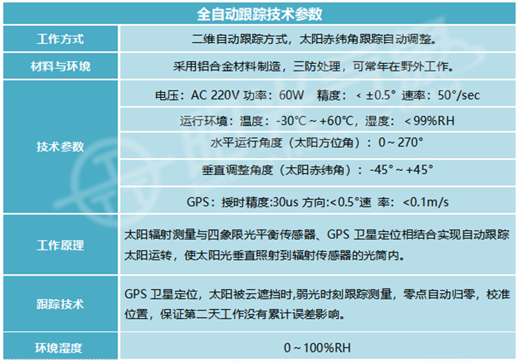 3、自主研發(fā)的太陽輻射儀是目前國內(nèi)最先進的無人值守型太陽輻射儀器,解決了傳統(tǒng)的光伏電站太陽輻射儀器需要人工維護的弊病,真正實現(xiàn)了全自動化測量的要求,它是將機器人控制技術與輻射測量技術完美結(jié)合的產(chǎn)品,系統(tǒng)采用太陽光追蹤+旋轉(zhuǎn)角度測量+輻射強度測量+GPS衛(wèi)星定位追蹤等