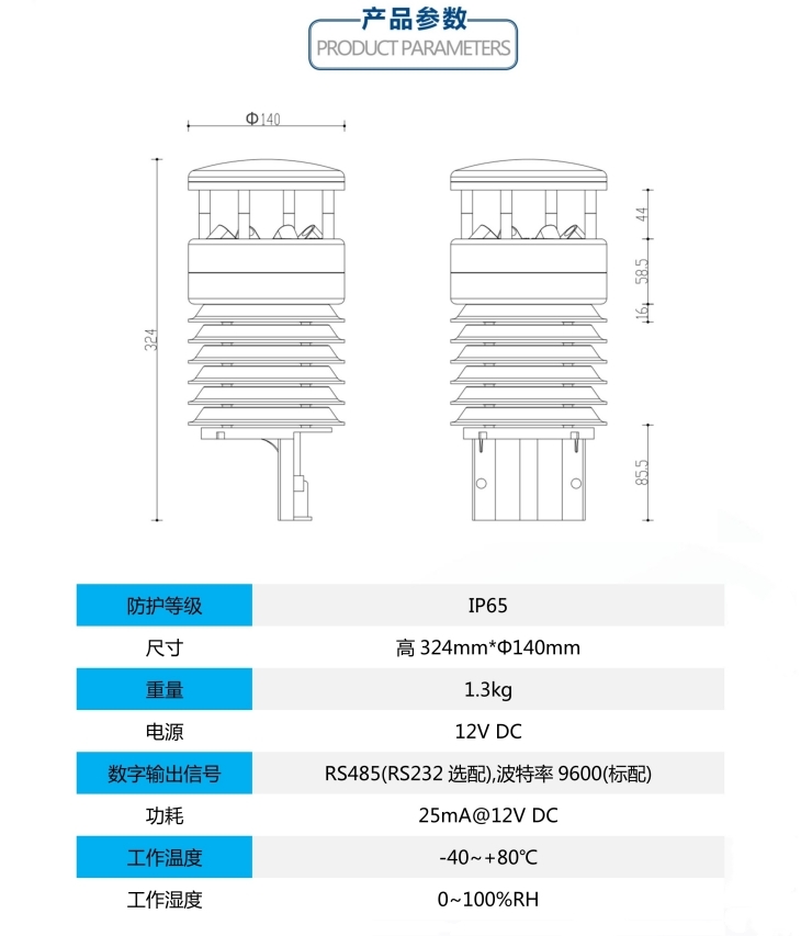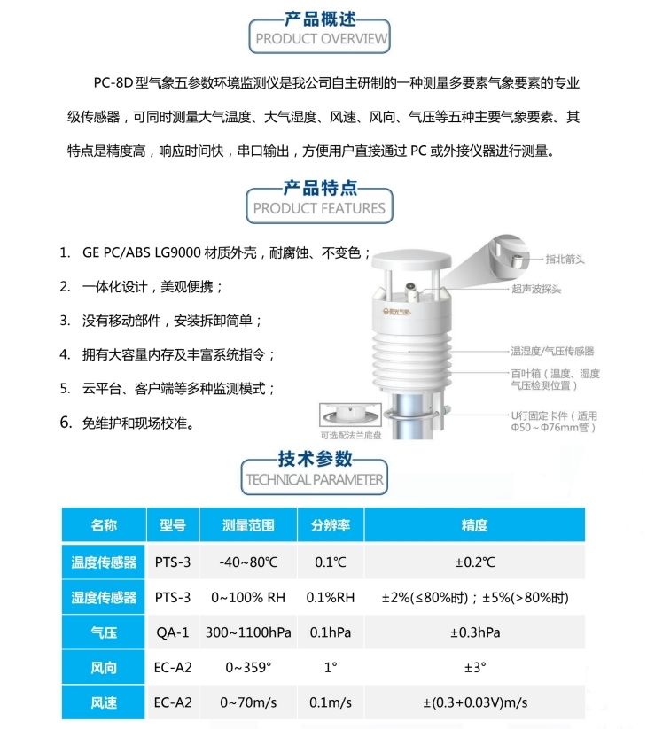 PC-8D型氣象五參數(shù)環(huán)境監(jiān)測(cè)儀是我公司自主研制的一種測(cè)量多要素氣象要素的傳感器,可同時(shí)測(cè)量大氣溫度、大氣濕度、風(fēng)速、風(fēng)向、氣壓等五種主要?dú)庀笠?。其特點(diǎn)是精度高,響應(yīng)時(shí)間快,串口輸出,方便用戶直接通過(guò)PC或外接儀器進(jìn)行測(cè)量。