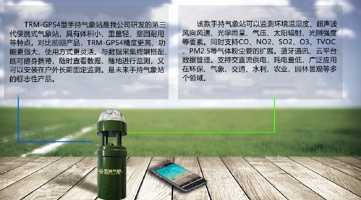 TRM-GPS4型手持氣象站是我公司研發(fā)的第三代手持式氣象儀器,具有體積小、重量輕、堅固耐用等特點。對比常規(guī)手持產(chǎn)品,TRM-GPS4精度更高、功能更強大、使用方式更靈活。與數(shù)據(jù)采集終端搭配,即可隨身攜帶、隨時查看數(shù)據(jù)、隨地進行監(jiān)測,又可以安裝在戶外長期固定監(jiān)測。是未來手持氣象站標志性產(chǎn)品。