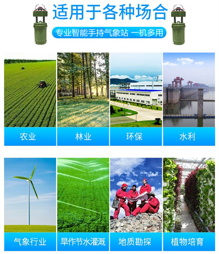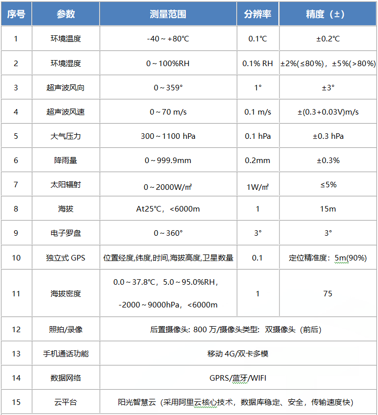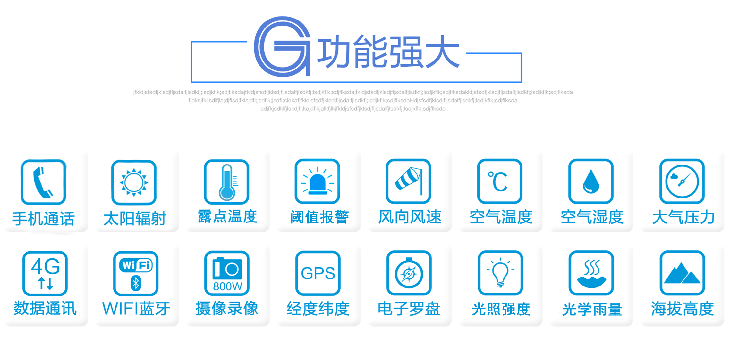 ●功能強大超越了目前所有的手持產(chǎn)品:測量要素為:風速,風向,氣壓,環(huán)境溫度,環(huán)境濕度,太陽輻射,露點,海拔高度,經(jīng)緯度,GPS衛(wèi)星定位,電子羅盤,,照拍/錄像 , 手機通話功能 , GPRS無線數(shù)據(jù)網(wǎng)絡,還可以拓展CO、NO2、SO2、O3、TVOC、PM2.5、PM10等監(jiān)測要素。