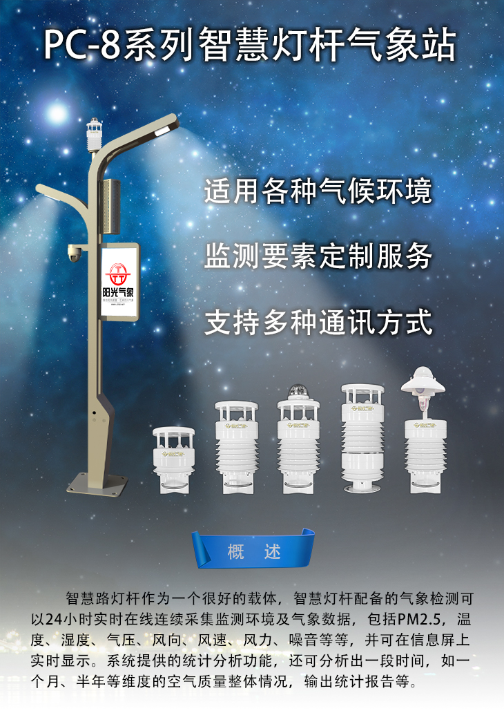 智慧路燈桿作為一個很好的載體,智慧燈桿配備的氣象檢測可以24小時實時在線連續(xù)采集監(jiān)測環(huán)境及氣象數(shù)據(jù),包括PM2.5,溫度、濕度、氣壓、風(fēng)向、風(fēng)速、風(fēng)力、噪音等等,并可在信息屏上實時顯示。系統(tǒng)提供的統(tǒng)計分析功能,還可分析出一段時間,如一個月、半年等維度的空氣質(zhì)量整體情況,輸出統(tǒng)計報告等。