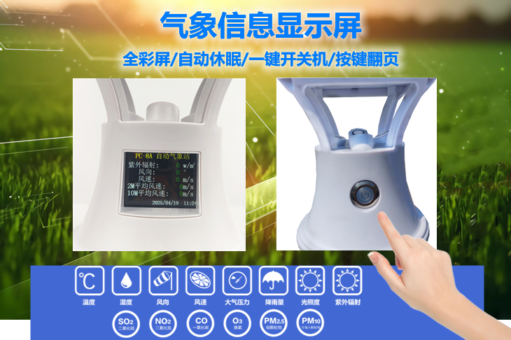 3. 全彩顯示屏和多功能按鍵:氣象站搭配了全彩顯示屏,彌補(bǔ)了常規(guī)氣象站無(wú)法就地顯示的缺陷,多功能按鍵可以實(shí)現(xiàn)一鍵開(kāi)關(guān)機(jī)、數(shù)據(jù)自動(dòng)翻頁(yè)和背光顯示等功能。