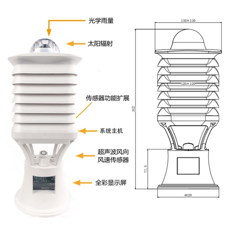 1. 一體化結(jié)構(gòu)設(shè)計(jì):采用一體化設(shè)計(jì),實(shí)現(xiàn)了太陽(yáng)輻射、溫度度、風(fēng)速風(fēng)向、氣壓、降雨量、氣體、噪聲粉塵等多種要素同步監(jiān)測(cè)。同時(shí)設(shè)備支持定制,可根據(jù)需求增減監(jiān)測(cè)要素。