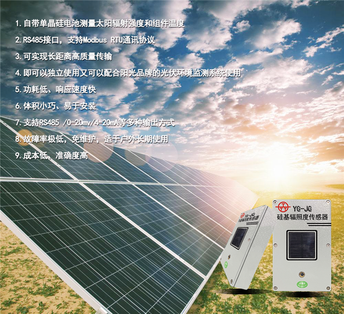 硅基輻照度傳感器是錦州陽光氣象科技有限公司根據(jù)太陽能電池板的特性,專門為光伏發(fā)電行業(yè)研制的一款低成本、高可靠性的太陽輻照度測量傳感器。