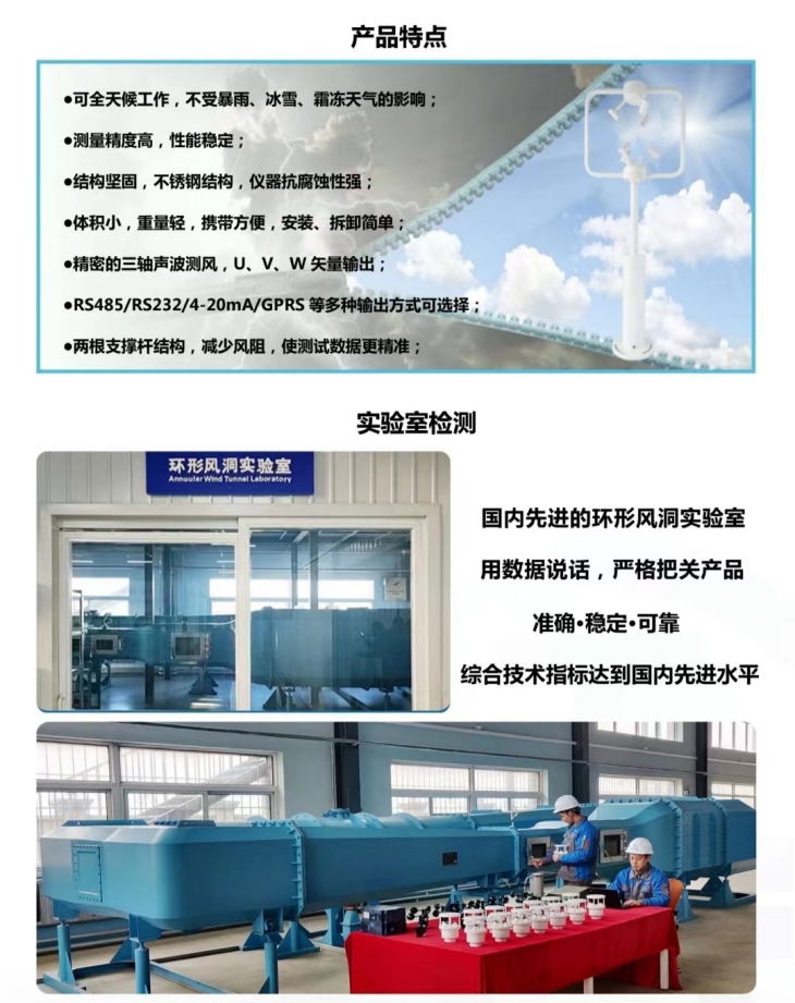 三維超聲波風(fēng)速風(fēng)向傳感器具有結(jié)構(gòu)緊湊,沒(méi)有任何移動(dòng)部件,堅(jiān)固 耐用的特點(diǎn)。能夠測(cè)量水平和垂直方向的風(fēng)向, X/Y/Z軸風(fēng)速(即U、V、 W矢量輸出)??梢赃m應(yīng)在各種環(huán)境下,全天候、長(zhǎng)久的正常工作,為各 領(lǐng)域的氣象監(jiān)測(cè)提供可靠數(shù)據(jù)。三維超聲波風(fēng)向風(fēng)速傳感器用來(lái)測(cè)量近 地風(fēng)向、風(fēng)速。廣泛應(yīng)用于城市環(huán)境監(jiān)測(cè)、風(fēng)力發(fā)電、氣象監(jiān)測(cè)、橋梁 隧道、航海船舶、航空機(jī)場(chǎng)等領(lǐng)域。