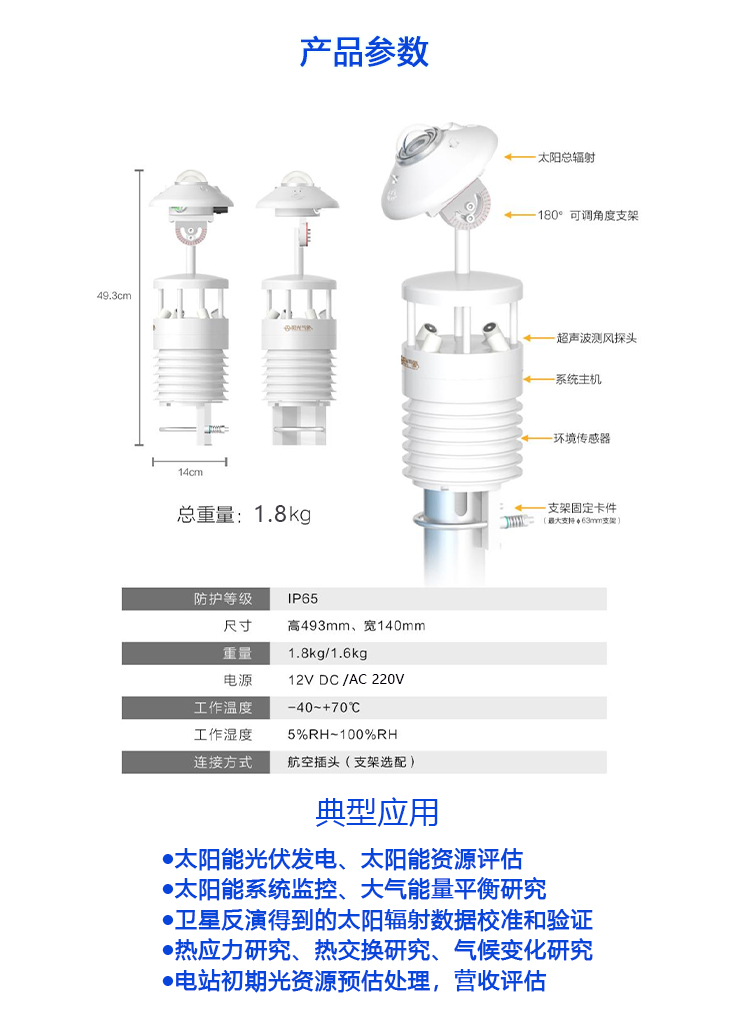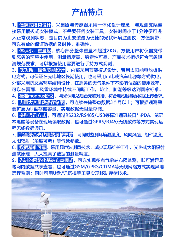 本產(chǎn)品是針對(duì)光伏發(fā)電站研發(fā)生產(chǎn)的一款最新型一體化光伏環(huán)境監(jiān)測儀,該設(shè)備采用新型一體化結(jié)構(gòu)設(shè)計(jì),測量精度高,安裝使用方便,可采集多種要素:含太陽輻射(水平/斜面)、溫度、濕度、風(fēng)速、風(fēng)向、大氣壓力、背板溫度等要素,要素可按需定制。