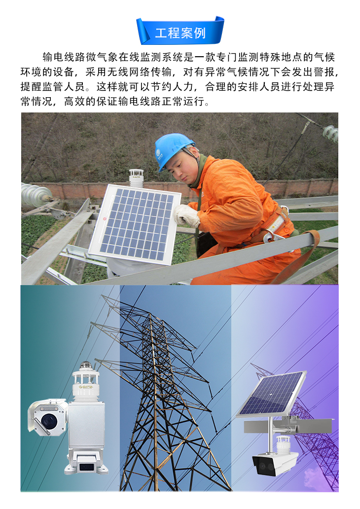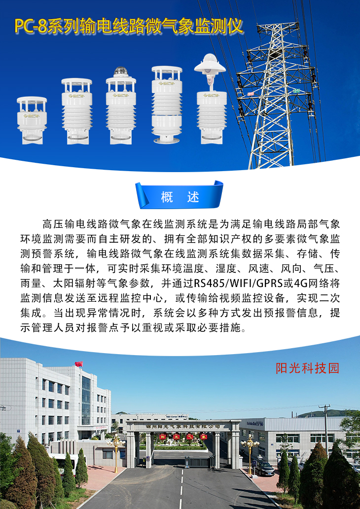 高壓輸電線路微氣象在線監(jiān)測系統(tǒng)是為滿足輸電線路局部氣象環(huán)境監(jiān)測需要而自主研發(fā)的、擁有全部知識產(chǎn)權(quán)的多要素微氣象監(jiān)測預(yù)警系統(tǒng),輸電線路微氣象在線監(jiān)測系統(tǒng)集數(shù)據(jù)采集、存儲、傳輸和管理于一體,可實時采集環(huán)境溫度、濕度、風(fēng)速、風(fēng)向、氣壓、雨量、太陽輻射等氣象參數(shù),并通過RS485/WiFi/GPRS或4G網(wǎng)絡(luò)將監(jiān)測信息發(fā)送至遠(yuǎn)程監(jiān)控中心,或傳輸給視頻監(jiān)控設(shè)備,實現(xiàn)二次集成。當(dāng)出現(xiàn)異常情況時,系統(tǒng)會以多種方式發(fā)出預(yù)報警信息,提示管理人員對報警點予以重視或采取必要措施。